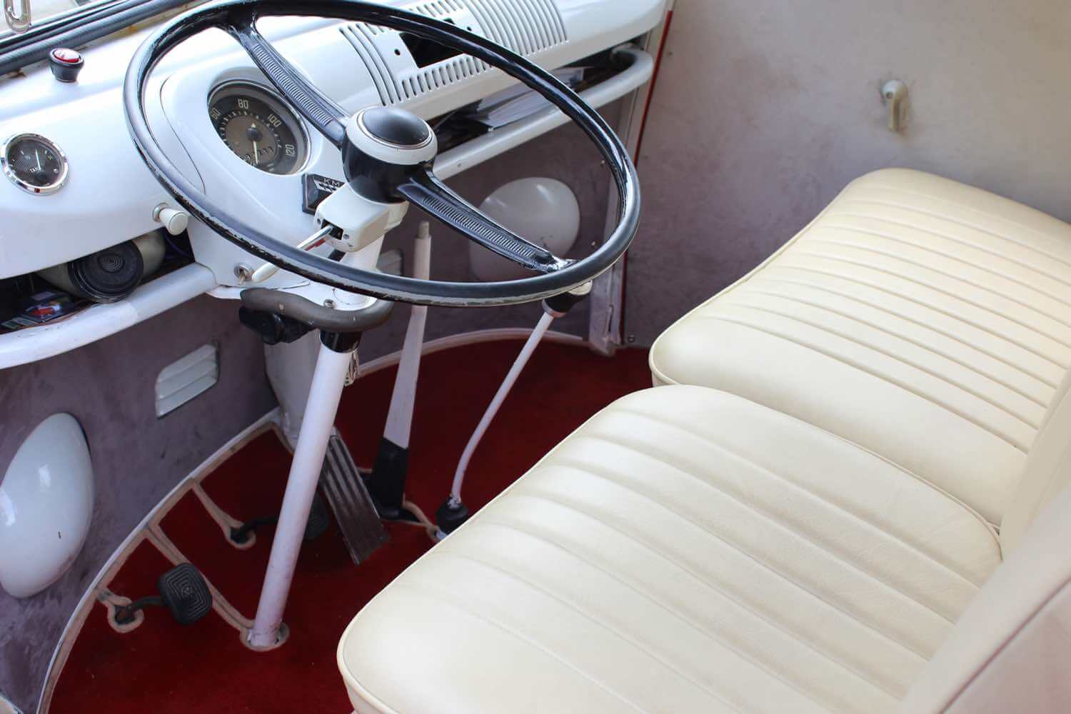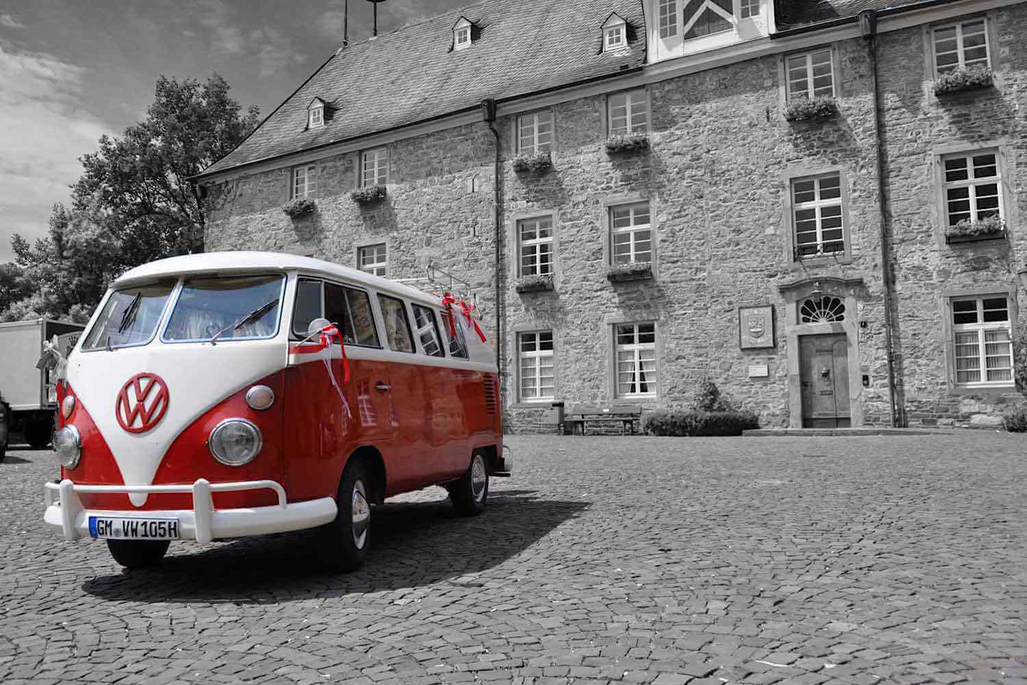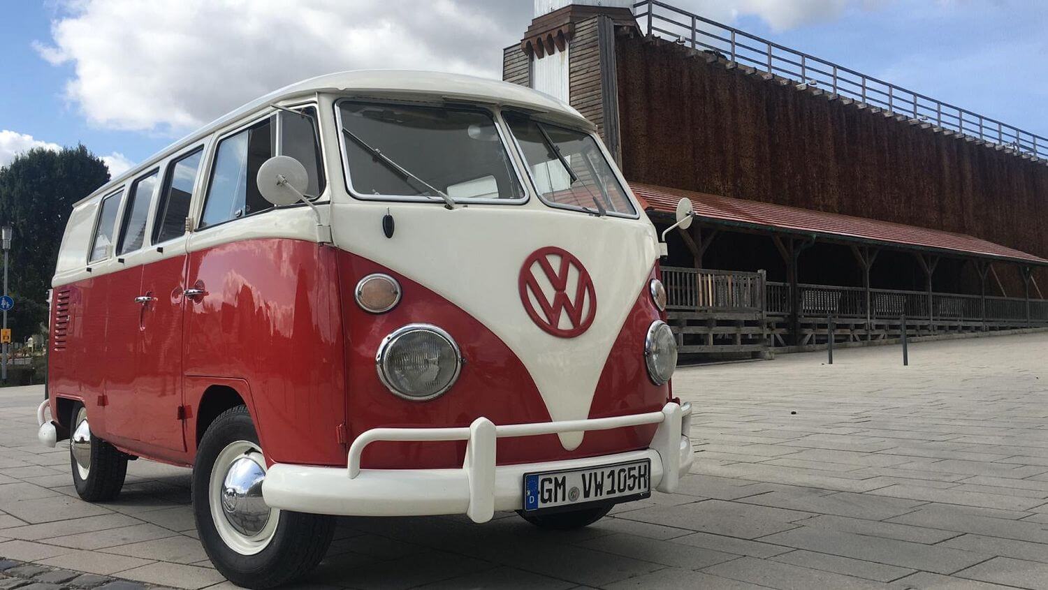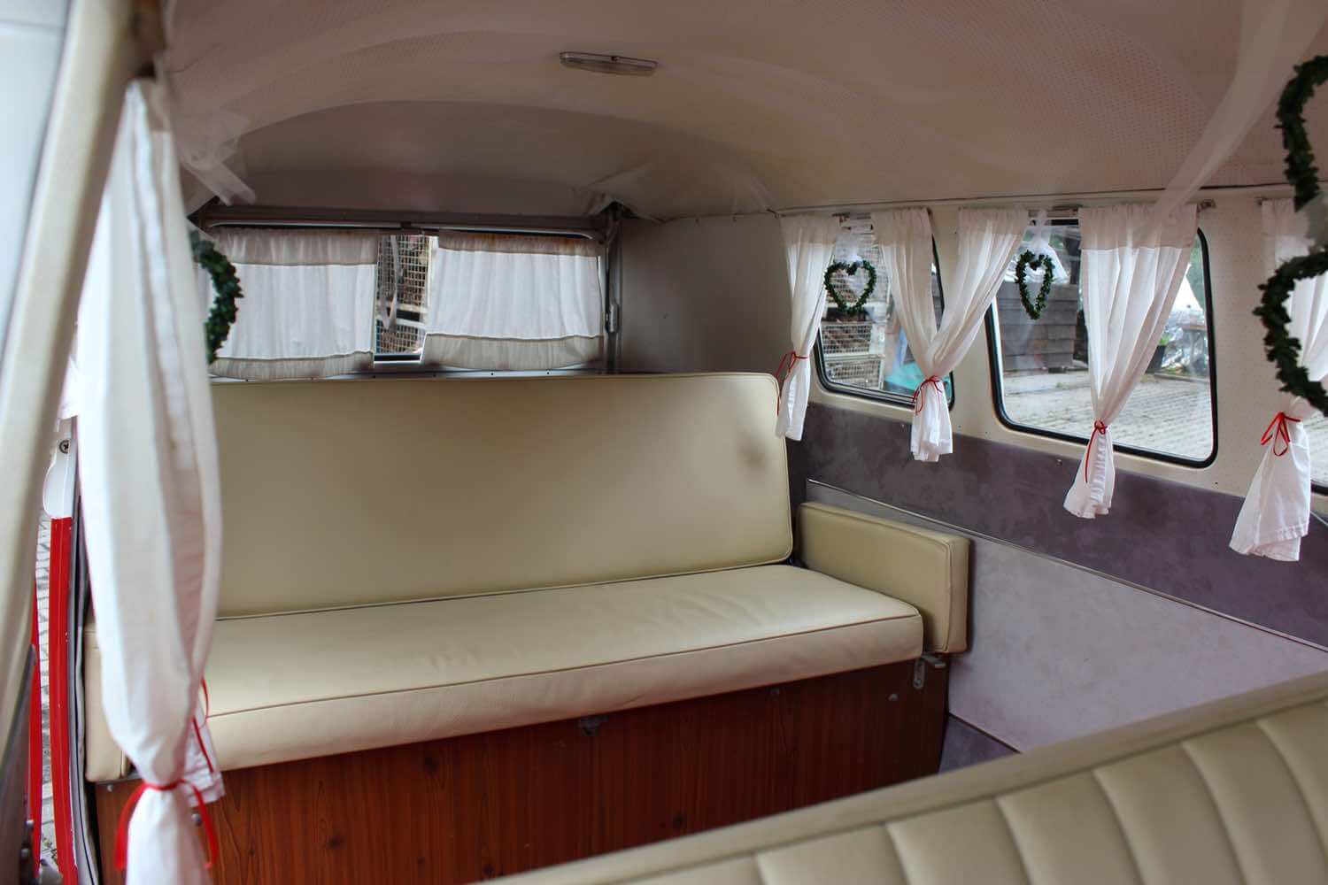 Unser rot-weiß lackierter 13-Fenster-Bus ist Baujahr 1966 mit originalen Innenausstattung und der geteilten Windschutzscheibe hat schon viele Veranstalter erfolgreich und Liebespaare glücklich gemacht. Um neben so viel Emotionen die Objektivität nicht aus den Augen zu verlieren, hier die ein paar Fakten: